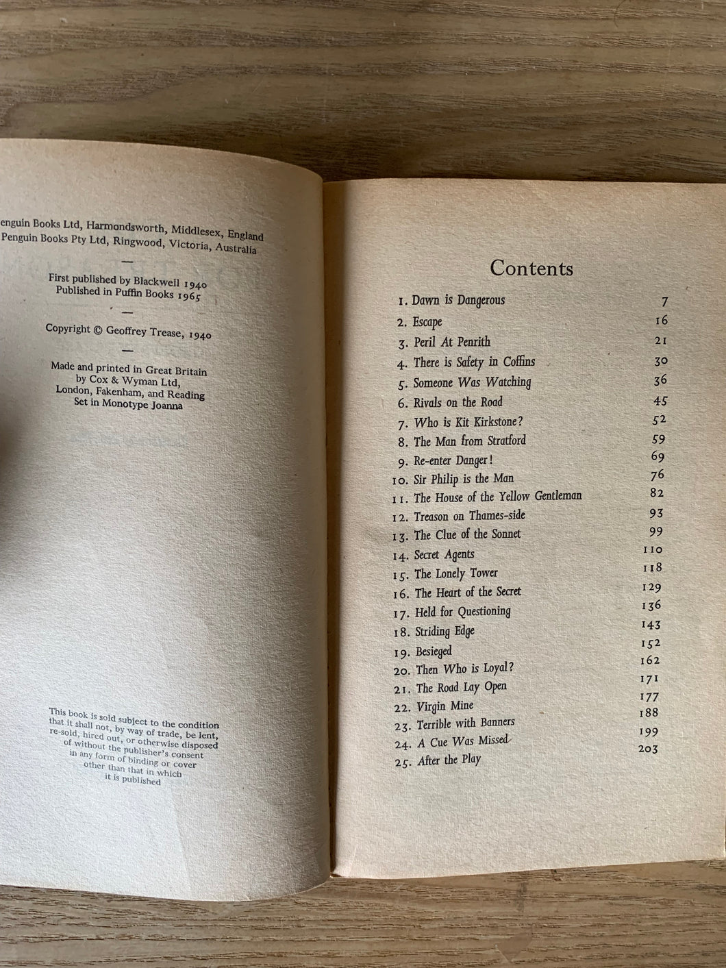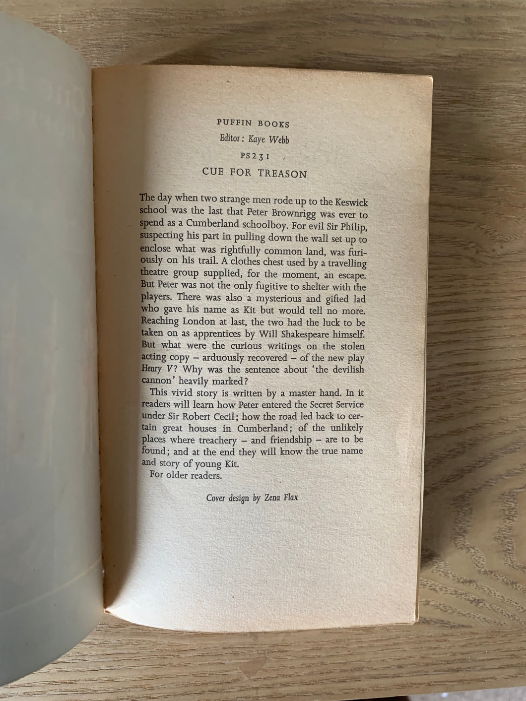 ‘Cue For Treason’ by Geoffrey Trease. Illustrated by Zena Flax. Published by Puffin Books. 1965. UK 1st edition thus. Card Covers. Number 231.