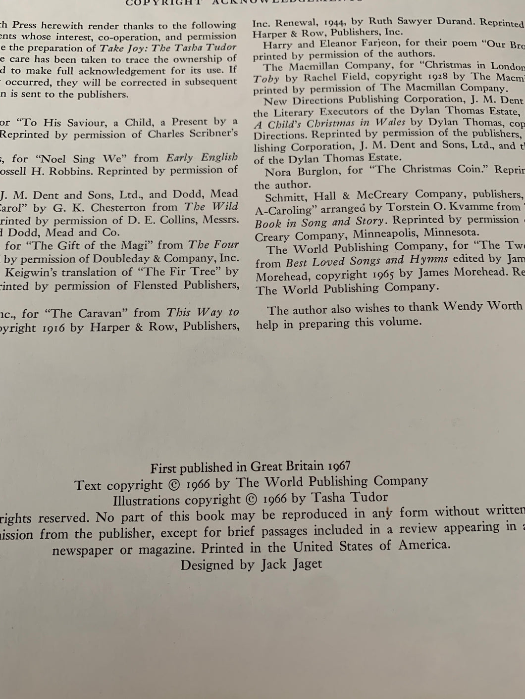 ‘Take Joy! The Tasha Tudor Christmas Book’ selected, edited and illustrated by Tasha Tudor. Published by Lutterworth Press. 1967. UK 1st Edition.