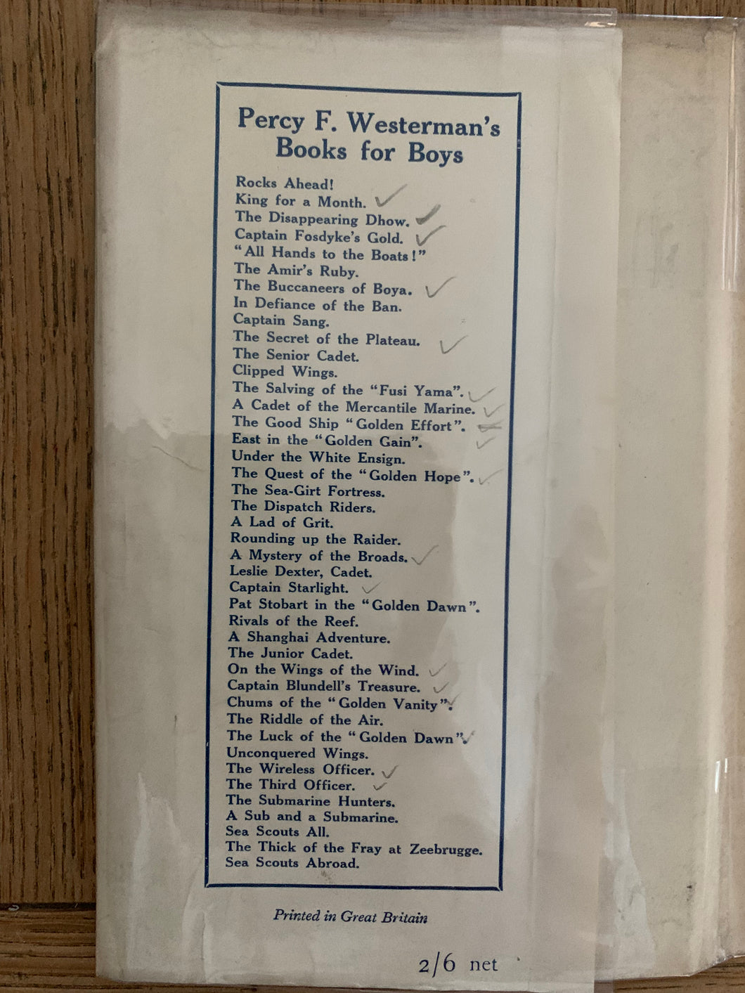 The dust wrapper is in very good condition and is not price clipped, with wear to the top/base of the spine and corners. There is a tear at the top edge of the front cover and two at either side of the top of the spine. The spine and rear cover are marked. Most of the titles listed on the front inside flap have a pencil tick next to them. The wrapper comes in a clear unattached protective cover.