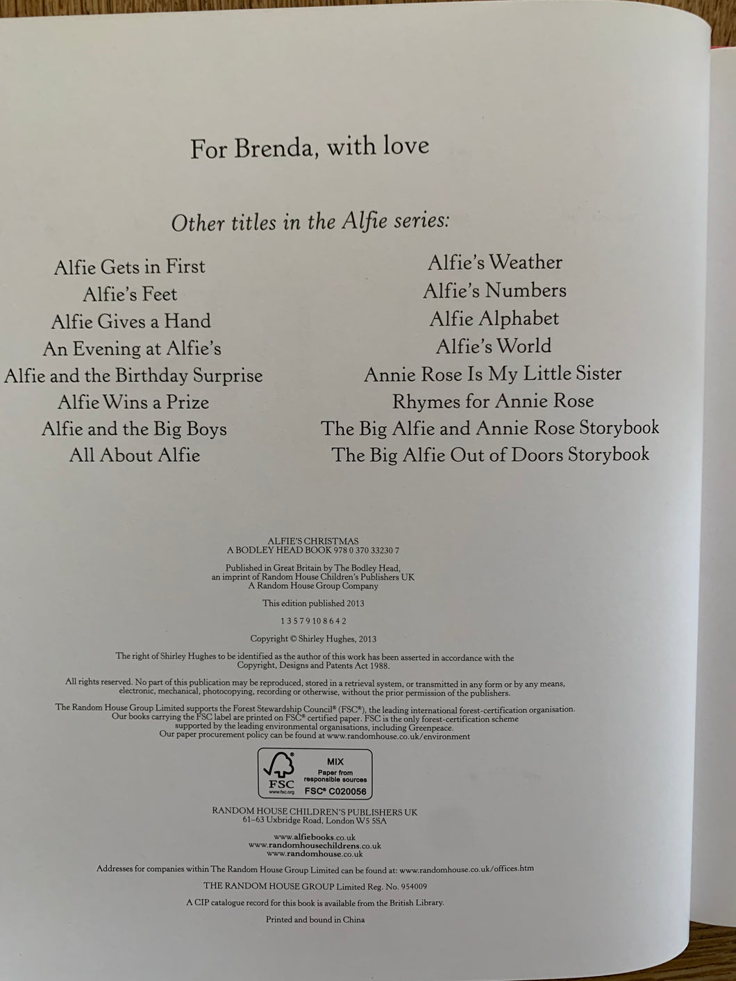 'Alfie's Christmas’ written and illustrated by Shirley Hughes. Published by Bodley Head. 2013. UK 1st edition.